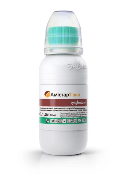 Фунгіцид Амістар Голд 250 (азоксистробін 125 г/л + дифенконазол 125 г/л) SC к.с. 100 мл, Syngenta – двокомпонентний фунгіцид системної та трансламінарної дії, призначений для обробки сільськогосподарських культур від широкого спектру грибкових захворювань. Препарат містить у складі дві діючі речовини: азоксистробін та дифеноконазол. Найкраща ефективність засобу проявляється при превентивних обробках на момент зараження.