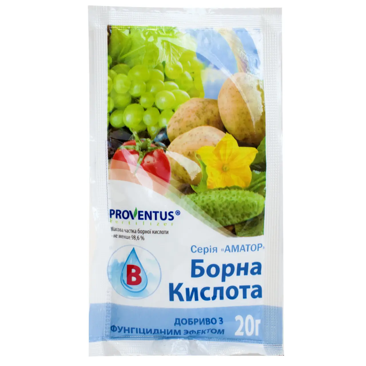 Препарат із високою концентрацією борної кислоти у вигляді добрива з фунгіцидним ефектом використовується для підживлення різних сільськогосподарських культур. При підживленні рослин борною кислотою відзначається збільшення врожайності та покращення смакових якостей плодів (оптимізується вміст цукрових, вітамінів, каротинів та антиоксидантів), а також підвищення інтенсивності цвітіння квіткових культур. Добриво борна кислота має фунгіцидні властивості і має протигрибкову, антибактеріальну, протипаразитарну (протипедикульозну) і дезінфікуючу дію на рослини, тому препарат використовують як профілактику різних захворювань на рослинах. Даний засіб не виявляє фітотоксичних властивостей при нормах витрати, що рекомендуються. Добриво борна кислота застосовують для підживлення всіх видів капусти, картоплі, цибулі ріпчастої, огірків, томатів, буряків, винограду, малини, полуниці, смородини, аґрусу, суниці, яблуні, груші, вишні, сливи, черешні, троянд та інших культур.
