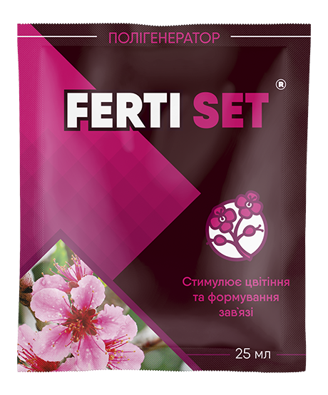 Ferti Set® – регулятор росту, який призначений для покращення процесу цвітіння, формування повноцінних квіток, поліпшення запилення та формування зав’язі. Особливо ефективним є застосувння препарату під час несприятливих умов під час квітування (заморозки, опади, туман). Склад препарату сформований таким чином, щоб спрямувати розвиток рослини, в першу чергу, на формування квіток та забезпечення процесу запилення та початку формування зав’язі.