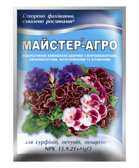 Майстер®-Агро – універсальне безхлорне, водорозчинне комплексне мінеральне добриво для підживлення всіх видів овочів, ягід, квітів і розсади. Збалансоване співвідношення макро- та мікроелементів задовольняє всі потреби рослин в елементах живлення на різних стадіях розвитку. Спеціально підібране поєднання амінокислот, фітогормонів та вітамінів стимулює утворення листя, цвітіння, забезпечує активне формування зав’язі, сприяє збільшенню врожайності, підвищує стійкість до захворювань, покращує приживлюваність розсади.