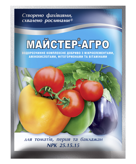 Майстер®-Агро – універсальне безхлорне, водорозчинне комплексне мінеральне добриво для підживлення всіх видів овочів, ягід, квітів і розсади. Збалансоване співвідношення макро- та мікроелементів задовольняє всі потреби рослин в елементах живлення на різних стадіях розвитку. Спеціально підібране поєднання амінокислот, фітогормонів та вітамінів стимулює утворення листя, цвітіння, забезпечує активне формування зав’язі, сприяє збільшенню врожайності, підвищує стійкість до захворювань, покращує приживлюваність розсади.