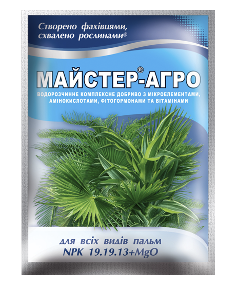 Майстер®-Агро – універсальне безхлорне, водорозчинне комплексне мінеральне добриво для підживлення всіх видів овочів, ягід, квітів і розсади. Збалансоване співвідношення макро- та мікроелементів задовольняє всі потреби рослин в елементах живлення на різних стадіях розвитку. Спеціально підібране поєднання амінокислот, фітогормонів та вітамінів стимулює утворення листя, цвітіння, забезпечує активне формування зав’язі, сприяє збільшенню врожайності, підвищує стійкість до захворювань, покращує приживлюваність розсади.