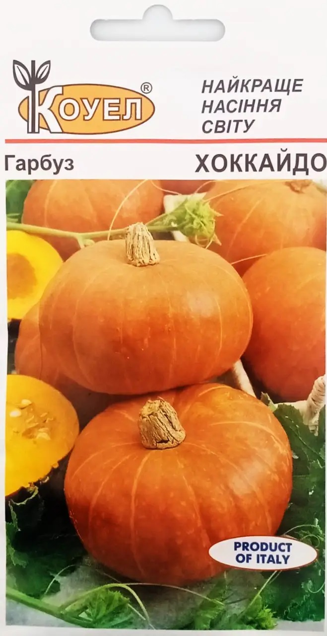 Гарбуз Хоккайдо – делікатесний сорт гарбуза раннього терміну дозрівання. Вегетаційний період 90-100 днів від перших сходів до початку збирання врожаю. Плоди компактного розміру, злегка плескаті, грушоподібні, з маленькою насіннєвою камерою, масою 1,5-2 кг. М’якуш не волокнистий, насиченого помаранчевого кольору, зручний для використання в кулінарних цілях, має приємний горіховий смак. Хоккайдо рекомендований для приготування дієтичних супів із кремовою консистенцією, пюре, запіканок та інших корисних страв. Також з м’якоті можна робити джеми, варення та цукати. Гарбуз легкий у вирощуванні і відмінно зберігається.