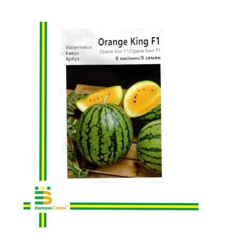 Оранж Кінг F1 – це ранньостиглий гібрид кавуна з яскраво-оранжевою м’якоттю, що має насичений солодкий смак та тонкий аромат. Його великі плоди масою 6-10 кг вирізняються міцною шкіркою, яка забезпечує гарну транспортабельність. Рослина стійка до хвороб і добре переносить перепади температур, що гарантує стабільний урожай навіть у змінних кліматичних умовах.