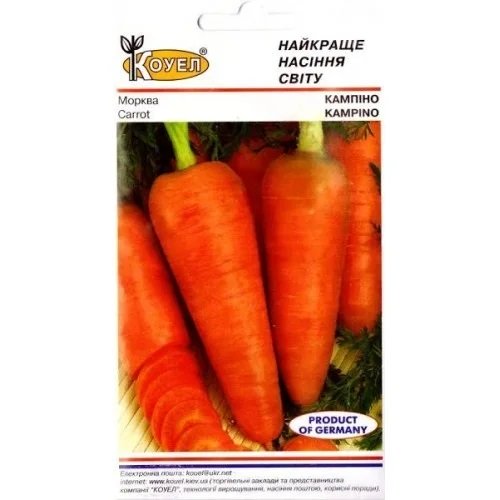 Морковь Кампино 2 грамма – Новий високоврожайний середньоранній сорт. Вегетаційний період 100-110 днів. Формує однорідні, конічної форми з маленькою серцевиною коренеплоди довжиною 12-15 см. М’якоть соковита, ніжна і солодка, має високі смакові якості і високий вміст каротину, тому цей сорт є одним з кращих для приготування соків і пюре. Коренеплоди прекрасно зберігається до квітня – травня. Німецьке насіння.