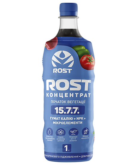 ROST® Концентрат – концентроване органо-мінеральне добриво на основі гумату калію, що містить комплекс макро- та мікроелементів. Добриво забезпечує рослини необхідними елементами живлення; мобілізує імунну систему рослин; покращує синтез цукрів, амінокислот, вітамінів в рослині; посилює поглинання води і кисню, що в результаті прискорює поділ клітин; інтенсифікує обмінні процеси; підвищує надходження поживних елементів в рослину; прискорює синтез нуклеїнових кислот і білка; активує білковий та вуглеводний обмін речовин; збільшує проникність клітинної мембрани; полегшує транспортування поживних речовин в середину клітини.