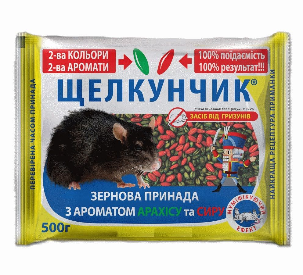 Родентицид Щелкунчик зернова принада 500 г, Агромаг – зелений + червоний колір зерна – приманка з ароматом арахісу і сиру готова до застосування для знищення щурів і мишей. Завдяки кращій рецептурі приманки гарантує – 100% знищення гризунів, – до складу приманки входить арахісовий – і сирний приваблювач, феромон, муміфікатор.
