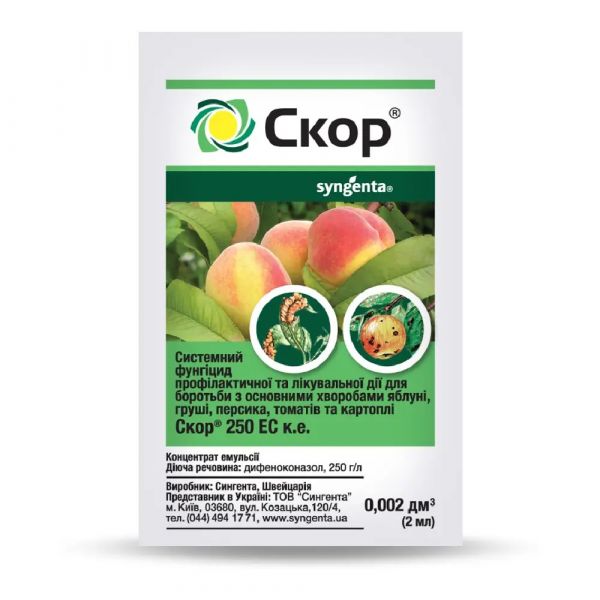 Скор® — неперевершений системний препарат для захисту плодових культур (яблуні й груші) від парші, а також персика від кучерявості листя. Препарат має надзвичайно сильну лікувальну (5 діб) і профілактичну (8–10 діб) дію проти збудників хвороб.
