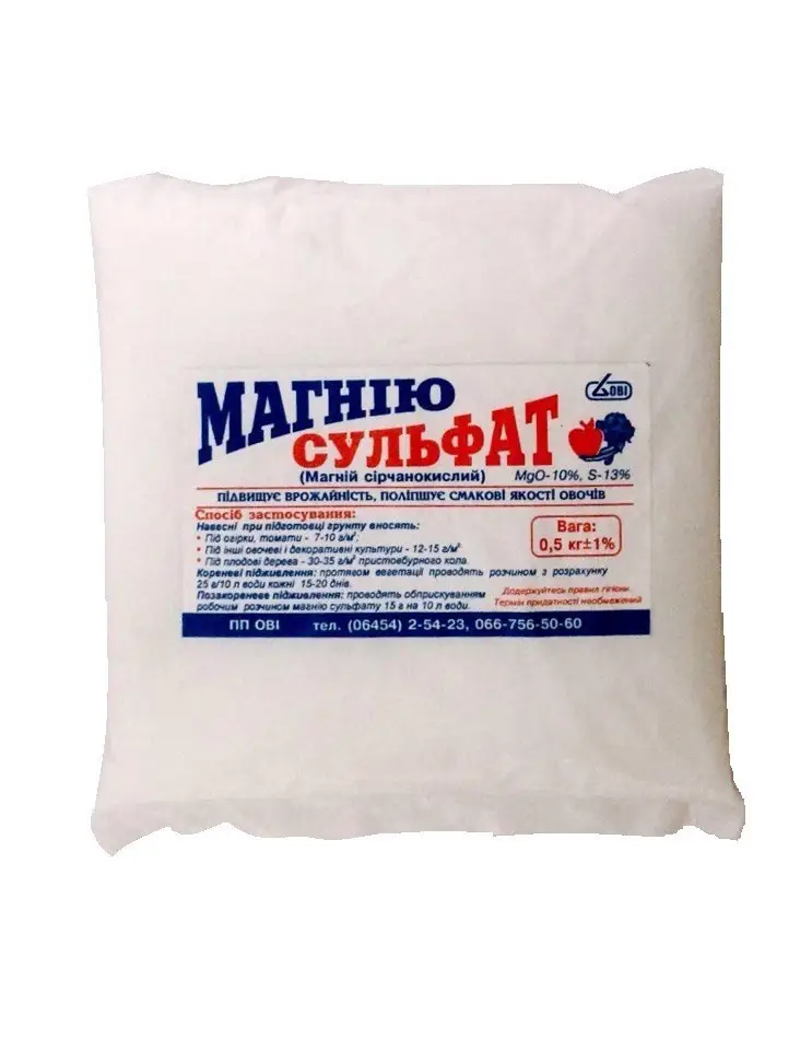 Сульфат магнію (Магній сірчанокислий) – магнієве добриво, яке добре розчиняється у води і не піддається злежування. Кристалічна Порошкоподібна речовина білого кольору. Вміст Магнію-10%